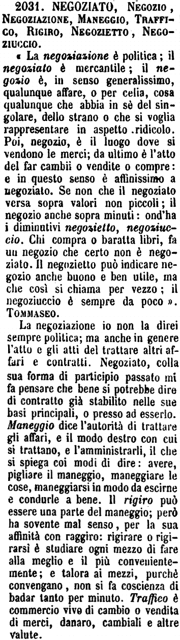 | Negoziato, Negozio, Negoziazione, Maneggio, Traffico, Rigiro, Negozietto, Negoziuccio - « La negoziazione è politica; il negoziato è mercantile; il negozio è, in senso generalissimo, qualunque affare, o per celia, cosa qualunque che abbia in sè del singolare, dello strano o che si voglia rappresentare in aspetto ridicolo. Poi, negozio, è il luogo dove si vendono le merci; da ultimo è l'atto del far cambii o vendite o compre: e in questo senso è affinissimo a negoziato. Se non che il negoziato versa sopra valori non piccoli; il negozio anche sopra minuti: ond'ha i diminutivi negozietto, negoziuccio. Chi compra o baratta libri, fa un negozio che certo non è negoziato. Il negozietto può indicare negozio anche buono e ben utile, ma che così si chiama per vezzo; il negoziuccio è sempre da poco ». Tommaseo.