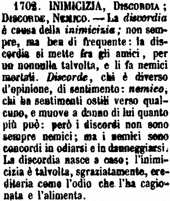 | Inimicizia, Discordia; Discorde, Nemico - La discordia è causa della inimicizia; non sempre, ma ben di frequente: la discordia si mette fra gli amici, per un nonnulla talvolta, e li fa nemici mortali. Discorde, chi è diverso d'opinione, di sentimento: nemico, chi ha sentimenti ostili verso qualcuno, e muove a danno di lui quanto più può: però i discordi non sono sempre nemici; ma i nemici sono concordi in odiarsi e in danneggiarsi. La discordia nasce a caso; l'inimicizia è talvolta, sgraziatamente, ereditaria come l'odio che l'ha cagionata e l'alimenta. [immagine] |