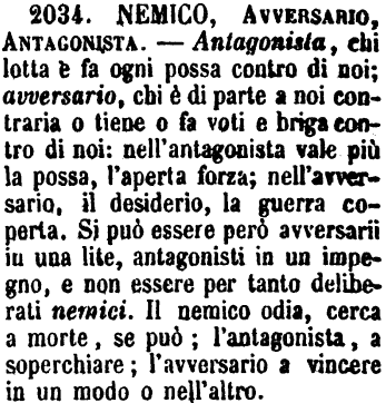 | Nemico, Avversario, Antagonista - Antagonista, chi lotta e fa ogni possa contro di noi; avversario, chi è di parte a noi contraria o tiene o fa voti e briga contro di noi: nell'antagonista vale più la possa, l'aperta forza; nell'avversario, il desiderio, la guerra coperta. Si può essere però avversarii in una lite, antagonisti in un impegno, e non essere per tanto deliberati nemici. Il nemico odia, cerca a morte, se può; l'antagonista, a soperchiare; l'avversario a vincere in un modo o nell'altro. [immagine] |