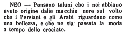 | Neo - Pensano taluni che i nei abbiano avuto origine dalie macchie nere sul volto che i Persiani e gli Arabi riguardano come una bellezza, e che ne sia passata la moda a tempo delle crociate. [immagine] |