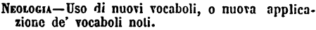 | Neologia - Uso di nuovi vocaboli, o nuova applicazione de' vocaboli noti. [immagine] |
