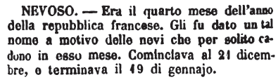 | Nevoso - Era il quarto mese dell'anno della repubblica francese. Gli fu dato un tal nome a motivo delle nevi che per solito cadono in esso mese. Cominciava al 21 dicembre, e terminava il 19 di gennajo. [immagine] |