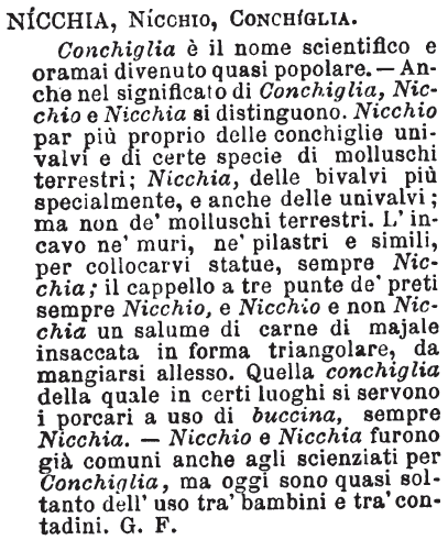 | Nicchia, Nicchio, Conchiglia - Conchiglia è il nome scientifico e oramai divenuto quasi popolare. - Anche nel significato di Conchiglia, Nicchio e Nicchia si distinguono. Nicchio par più proprio delle conchiglie univalvi e di certe specie di molluschi terrestri; Nicchia, delle bivalvi più specialmente, e anche delle univalvi; ma non de' molluschi terrestri. L'incavo ne' muri, ne' pilastri e simili, per collocarvi statue, sempre Nicchia; il cappello a tre punte de' preti sempre Nicchio, e Nicchio e non Nicchia un salume di carne di majale insaccata in forma triangolare, da mangiarsi allesso. Quella conchiglia della quale in certi luoghi si servono i porcari a uso di buccina, sempre Nicchia. - Nicchio e Nicchia furono già comuni anche agli scienziati per Conchiglia, ma oggi sono quasi soltanto dell'uso tra' bambini e tra' contadini. G. F. [immagine] |