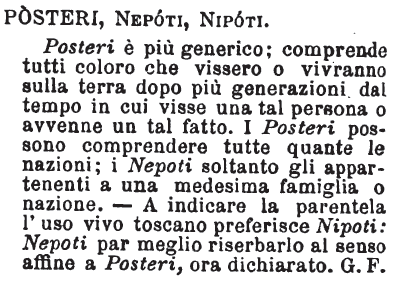 | Posteri, Nepoti, Nipoti - Posteri è più generico; comprende tutti coloro che vissero o vivranno sulla terra dopo più generazioni dal tempo in cui visse una tal persona o avvenne un tal fatto. I Posteri possono comprendere tutte quante le nazioni; i Nepoti soltanto gli appartenenti a una medesima famiglia o nazione. - A indicare la parentela l'uso vivo toscano preferisce Nipoti: Nepoti par meglio riserbarlo al senso affine a Posteri, ora dichiarato. G. F. [immagine] |