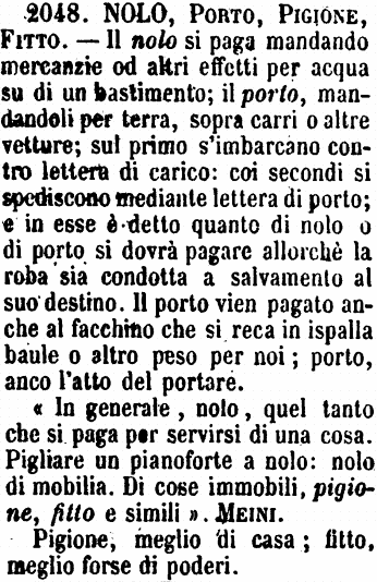 «In generale, nolo, quel tanto che si paga per servirsi di una cosa. Pigliare un pianoforte a nolo: nolo di mobilia. Di cose immobili, pigione, fitto e simili». Meini. Pigione, meglio di casa; fitto, meglio forse di poderi. [immagine] |