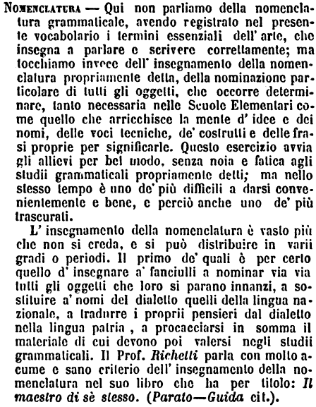L'insegnamento della nomenclatura è vasto più che non si creda, e si può distribuire in varii gradi o periodi. Il primo de' quali è per certo quello d'insegnare a' fanciulli a nominar via via tutti gli oggetti che loro si parano innanzi, a sostituire a' nomi del dialetto quelli della lingua nazionale, a tradurre i proprii pensieri dal dialetto nella lingua patria, a procacciarsi in somma il materiale di cui devono poi valersi negli studii grammaticali. Il Prof. Richetti parla con molto acume e sano criterio dell'insegnamento della nomenclatura nel suo libro che ha per titolo: Il maestro di sè stesso. (Parato - Guida cit.). [immagine] |