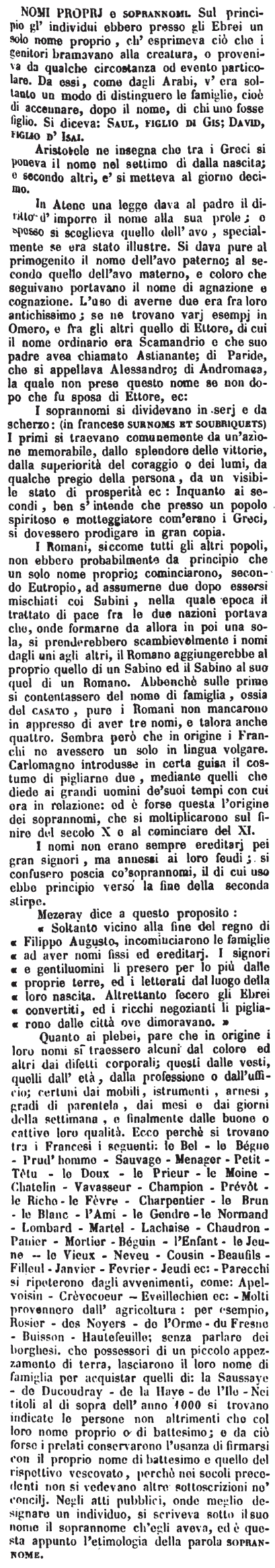 | Nomi - Gli Ebrei, gli Egizj, i Persiani, e anco i Greci non avevano che un solo Nome. Se talvolta ne avevano due, era piuttosto un Soprannome che un Nome proprio; ed in tal caso serviva a indicare o il paese, o qualche singolarità o virtù, o difetto dello spirito, o del corpo. In generale non eravi che un mezzo conducente a distinguere le diverse Famiglie, e questo consisteva nell'esprimere dopo del Nome quello del Padre o di chi fosse Figlio.