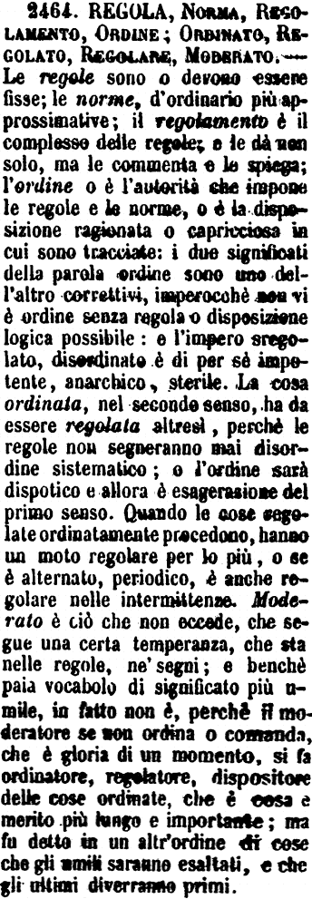 | Regola, Norma, Regolamento, Ordine; Ordinato, Regolato, Regolare, Moderato - Le regole sono o devono essere fisse; le norme, d'ordinario più approssimative; il regolamento è il complesso delle regole: e le dà non solo, ma le commenta e le spiega; l'ordine o è l'autorità che impone le regole e le norme, o è la disposizione ragionata o capricciosa in cui sono tracciate: i due significati della parola ordine sono uno dell'altro correttivi, imperocchè non vi è ordine senza regola o disposizione logica possibile: e l'impero sregolato, disordinato è di per sè impotente, anarchico, sterile. La cosa ordinata, nel secondo senso, ha da essere regolata altresì, perchè le regole non segneranno mai disordine sistematico; o l'ordine sarà dispotico e allora è esagerazione del primo senso. Quando le cose regolate ordinatamente procedono, hanno un moto regolare per lo più, o se è alternato, periodico, è anche regolare nelle intermittenze. Moderato è ciò che non eccede, che segue una certa temperanza, che sta nelle regole, ne' segni; e benchè paia vocabolo di significato più umile, in fatto non è, perchè il moderatore se non ordina o comanda, che è gloria di un momento, si fa ordinatore, regolatore, dispositore delle cose ordinate, che è cosa e merito più lungo e importante; ma fu detto in un altr'ordine di cose che gli umili saranno esaltati, e che gli ultimi diverranno primi. [immagine] |