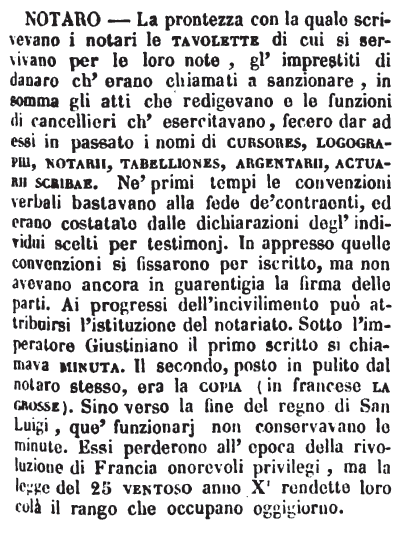 | Notaro - La prontezza con la quale scrivevano i notari le tavolette di cui si servivano per le loro note, gl'imprestiti di danaro ch'erano chiamati a sanzionare, in somma gli atti che redigevano e le funzioni di cancellieri ch'esercitavano, fecero dar ad essi in passato i nomi di cursores, logographi, notarii, tabelliones, argentarii, actuarii scribae. Ne' primi tempi le convenzioni verbali bastavano alla fede de' contraenti, ed erano costatate dalle dichiarazioni degl'individui scelti per testimonj. In appresso quelle convenzioni si fissarono per iscritto, ma non avevano ancora in guarentigia la firma delle parti. Ai progressi dell'incivilimento può attribuirsi l'istituzione del notariato. Sotto l'imperatore Giustiniano il primo scritto si chiamava minuta. Il secondo, posto in pulito dal notaro stesso, era la copia (in francese la grosse). Sino verso la fine del regno di San Luigi, que' funzionarj non conservavano le minute. Essi perderono all'epoca della rivoluzione di Francia onorevoli privilegi, ma la legge del 25 ventoso anno X' rendette loro colà il rango che occupano oggigiorno. [immagine] |