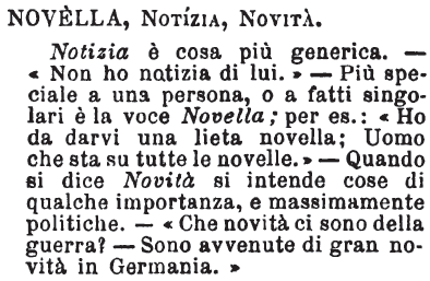 | Novella, Notizia, Novità - Notizia è cosa più generica. - «Non ho notizia di lui.» - Più speciale a una persona, o a fatti singolari è la voce Novella; per es.: «Ho da darvi una lieta novella; Uomo che sta su tutte le novelle.» - Quando si dice Novità si intende cose di qualche importanza, e massimamente politiche. - «Che novità ci sono della guerra? - Sono avvenute di gran novità in Germania.» [immagine] |