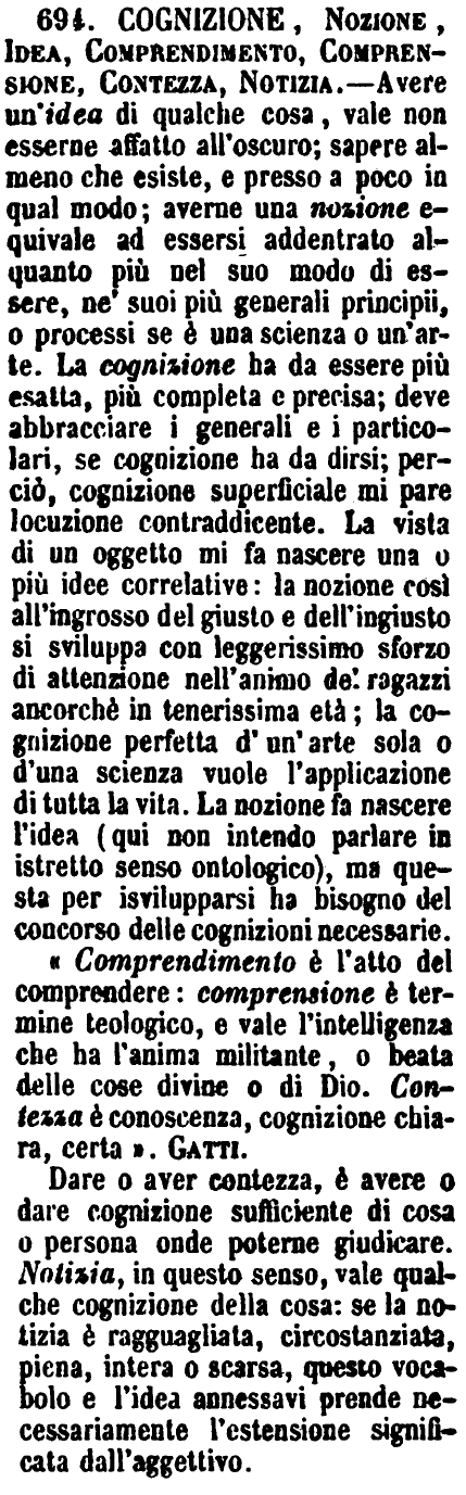 Cognizione, Nozione, Idea, Comprendimento, Comprensione, Contezza, Notizia - Avere un'idea di qualche cosa, vale non esserne affatto all'oscuro; sapere almeno che esiste, e presso a poco in qual modo; averne una nozione equivale ad essersi addentrato alquanto più nel suo modo di essere, ne' suoi più generali principii, o processi se è una scienza o un'arte. La cognizione ha da essere più esatta, più completa e precisa; deve abbracciare i generali e i particolari, se cognizione ha da dirsi; perciò, cognizione superficiale mi pare locuzione contraddicente. La vista di un oggetto mi fa nascere una o più idee correlative: la nozione così all'ingrosso del giusto e dell'ingiusto si sviluppa con leggerissimo sforzo di attenzione nell'animo de' ragazzi ancorchè in tenerissima età; la cognizione perfetta d'un'arte sola o d'una scienza vuole l'applicazione di tutta la vita. La nozione fa nascere l'idea (qui non intendo parlare in istretto senso ontologico), ma questa per isvilupparsi ha bisogno del concorso delle cognizioni necessarie.