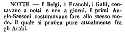 | Notte - I Belgi, i Franchi, i Galli, contavano a notti e non a giorni. I primi Anglo-Sassoni costumavano fare allo stesso modo, il quale si pratica pure abitualmente tra gli Arabi. [immagine] |