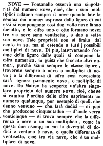 | Nove - Fontanelle osservò una singolarità del numero nove, cioè, che i suoi moltiplici ridanno sempre il nove quando fate la somma dei numeri espressi dalle figure di cui essi si compongono: così due volte nove fanno diciotto, e le cifre uno e otto formano nove; tre via nove sono ventisette, e due e sette son nove. Tale proprietà non si limita dal cento in su, ma si estende a tutti i possibili moltiplici di nove. Di più, intervertendo l'ordine delle figure delle quali si compone la cifra numerica, in guisa che facciate altri numeri, purchè siano sempre le stesse figure, troverete sempre o nove o moltiplici di nove; e la differenza di cifre così rovesciate sarà ognora parimente nove, o moltiplici di nove. De Mairan ha scoperto un'altra singolare proprietà del numero nove, cioè, che se si cambia l'ordine delle cifre esprimenti un numero qualunque, per esempio di quelli che danno ventuno - che farà dodici - di quei che producono cinquantadue - d'onde verrà venticinque - si trova sempre che la differenza è nove o un suo moltiplice, come in questi due esempi in cui la diversità di dodici e ventuno è nove, e quella differenza di ventisette, cioè tre via nove, che è un moltiplice di nove. [immagine] |