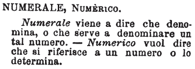 | Numerale, Numerico - Numerale viene a dire che denomina, o che serve a denominare un tal numero. - Numerico vuol dire che si riferisce a un numero o lo determina. [immagine] |