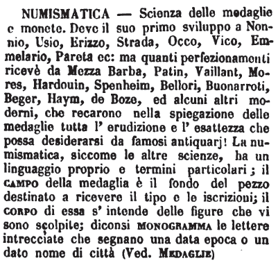| Numismatica - Scienza delle medaglie e monete. Deve il suo primo sviluppo a Nonnio, Usio, Erizzo, Strada, Occo, Vico, Emmelario, Pareta ec: ma quanti perfezionamenti ricevè da Mezza Barba, Patin, Vaillant, Mores, Hardouin, Spenheim, Bellori, Buonarroti, Beger, Haym, de Boze, ed alcuni altri moderni, che recarono nella spiegazione delle medaglie tutta l'erudizione e l'esattezza che possa desiderarsi da famosi antiquarj! La numismatica, siccome le altre scienze, ha un linguaggio proprio e termini particolari; il campo della medaglia è il fondo del pezzo destinato a ricevere il tipo e le iscrizioni; il corpo di essa s'intende delle figure che vi sono scolpite; diconsi monogramma le lettere intrecciate che segnano una data epoca o un dato nome di città (Ved. Medaglie) [immagine] |