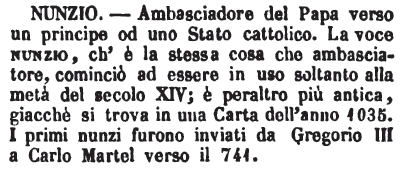 | Nunzio - Ambasciadore del Papa verso un principe od uno Stato cattolico. La voce nunzio, ch'è la stessa cosa che ambasciatore, cominciò ad essere in uso soltanto alla metà del secolo XIV; è peraltro più antica, giacchè si trova in una Carta dell'anno 1035. I primi nunzi furono inviati da Gregorio III a Carlo Martel verso il 741. [immagine] |