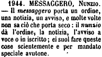 | Messaggero, Nunzio - Il messaggero porta un ordine, una notizia, un avviso, e molte volte non sa ciò che porta seco: il nunzio dà l'ordine, la notizia, l'avviso a voce o in iscritto; ei suol fare queste cose scientemente e per mandato speciale avutone. [immagine] |