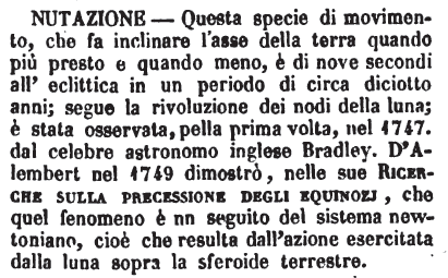 | Nutazione - Questa specie di movimento, che fa inclinare l'asse della terra quando più presto e quando meno, è di nove secondi all'eclittica in un periodo di circa diciotto anni; segue la rivoluzione dei nodi della luna; è stata osservata, pella prima volta, nel 1747. dal celebre astronomo inglese Bradley. D'Alembert nel 1749 dimostrò, nelle sue Ricerche sulla precessione degli equinozj, che quel fenomeno è un seguito del sistema newtoniano, cioè che resulta dall'azione esercitata dalla luna sopra la sferoide terrestre. [immagine] |