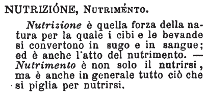 | Nutrizione, Nutrimento - Nutrizione è quella forza della natura per la quale i cibi e le bevande si convertono in sugo e sangue; ed è anche l'atto del nutrimento. - Nutrimento è non solo il nutrirsi, ma è anche in generale tutto ciò che si piglia per nutrirsi. [immagine] |