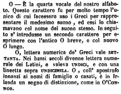 O, lettera numerica de' Greci vale settanta. Nei bassi secoli divenne lettera numerale dei Latini, e valeva undici, e con una lineetta sopra undicimila. O, coll'apostrofo innanzi ai nomi di famiglie o casati, è in Irlanda un segno di distinzione, come in O'Connor. [immagine] |