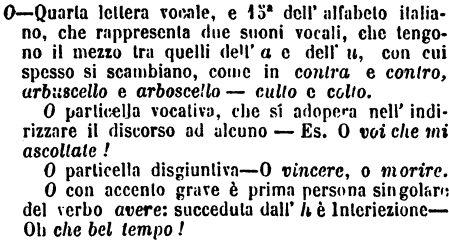 O - Quarta lettera vocale, e 15a dell'alfabeto italiano, che rappresenta due suoni vocali, che tengono il mezzo tra quelli dell'a e dell'u, con cui spesso si scambiano, come in contra e contro, arbuscello e arboscello - culto e colto.