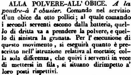 | Alla polvere - All'obice - A la poudre-à l'obusier. Comando nel servizio d'un obice da otto pollici; al quale comando i secondi serventi escono dalla batteria, quello di dritta va a prendere la polvere, e quello di sinistra la granata. Per l'esecuzione di questo movimento, si eseguirà quanto è prescritto nell'istruzione relativa al mortaio; colla sola differenza, che quivi i serventi in vece di mettersi in filla, si situano dirimpetto a' loro posti rispettivi. [immagine] |