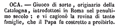 | Oca - OCA. - Giuoco di sorte, originario della Catalogna, introdottosi in Roma nel penultimo secolo; e vi cagionò la rovina di tante famiglie, che il Papa fu costretto a proibirlo. [immagine] |