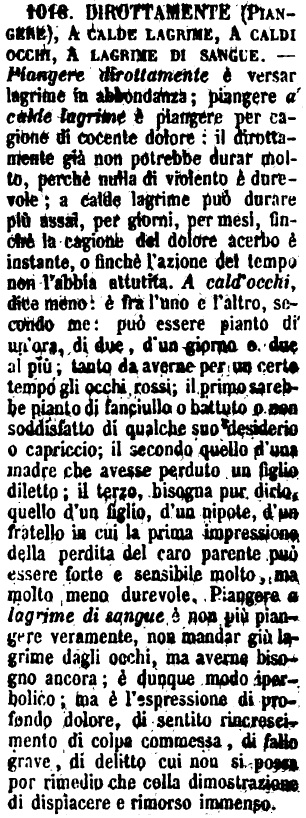 | Dirottamente (piangere), A calde lagrime, A caldi occhi, A lagrime di sangue - Piangere dirottamente è versar lagrime in abbondanza; piangere a calde lagrime è piangere per cagione di cocente dolore; il dirottamente già non potrebbe durar molto, perchè nulla di violento è durevole; a calde lagrime può durare più assai, per giorni, per mesi, finchè la cagione del dolore acerbo è instante, o finchè l'azione del tempo non l'abbia attutita. A cald'occhi, dice meno: è fra l'uno e l'altro, secondo me: può essere pianto di un'ora, di due, d'un giorno o due al più; tanto da averne per un certo tempo gli occhi rossi; il primo sarebbe pianto di fanciullo o battuto o non soddisfatto di qualche suo desiderio o capriccio; il secondo quello d'una madre che avesse perduto un figlio diletto; il terzo, bisogna pur dirlo, quello d'un figlio, d'un nipote, d'un fratello in cui la prima impressione della perdita del caro parente può essere forte e sensibile molto, ma molto meno durevole. Piangere a lagrime di sangue è non più piangere veramente, non mandar giù lagrime dagli occhi, ma averne bisogno ancora; è dunque modo iperbolico; ma è l'espressione di profondo dolore, di sentito rincrescimento di colpa commessa, di fallo grave, di delitto cui non si possa por rimedio che colla dimostrazione di dispiacere e rimorso immenso. [immagine] |