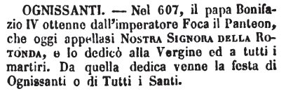 | Ognissanti - Nel 607, il papa Bonifazio IV ottenne dall'imperatore Foca il Panteon, che oggi appellasi Nostra Signora della Rotonda, e lo dedicò alla Vergine ed a tutti i martiri. Da quella dedica venne la festa di Ognissanti o di Tutti i Santi. [immagine] |