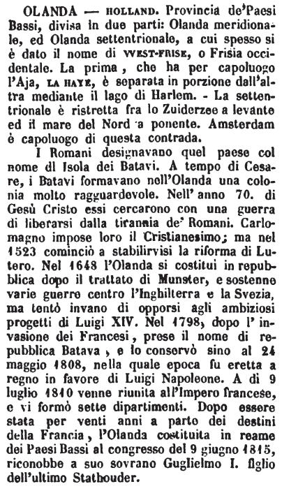 I Romani designavano quel paese col nome di Isola dei Batavi. A tempo di Cesare, i Batavi formavano nell'Olanda una colonia molto ragguardevole. Nell'anno 70. di Gesù Cristo essi cercarono con una guerra di liberarsi dalla tirannia de' Romani. Carlomagno impose loro il Cristianesimo; ma nel 1523 cominciò a stabilirvisi la riforma di Lutero. Nel 1648 l'Olanda si costituì in repubblica dopo il trattato di Munster, e sostenne varie guerre contro l'Inghilterra e la Svezia, ma tentò invano di opporsi agli ambiziosi progetti di Luigi XIV. Nel 1798, dopo l'invasione dei Francesi, prese il nome di repubblica Batava, e lo conservò sino al 24 maggio 1808, nella quale epoca fu eretta a regno in favore di Luigi Napoleone. A dì 9 luglio 1810 venne riunita all'Impero francese, e vi formò sette dipartimenti. Dopo essere stata per venti anni a parte dei destini della Francia, l'Olanda costituita in reame dei Paesi Bassi al congresso del 9 giugno 1815, riconobbe a suo sovrano Guglielmo I. figlio dell'ultimo Stathouder. [immagine] |