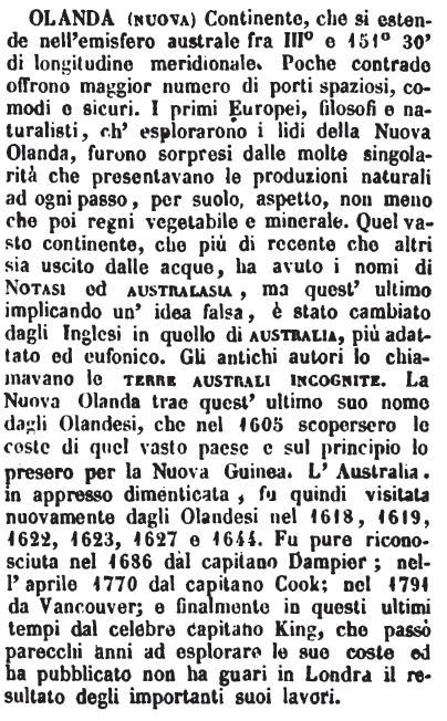 | Olanda (Nuova) - Continente, che si estende nell'emisfero australe fra III° e 151° 30' di longitudine meridionale. Poche contrade offrono maggior numero di porti spaziosi, comodi e sicuri. I primi Europei, filosofi e naturalisti, ch'esplorarono i lidi della Nuova Olanda, furono sorpresi dalle molte singolarità che presentavano le produzioni naturali ad ogni passo, per suolo, aspetto, non meno che pei regni vegetabile e minerale. Quel vasto continente, che più di recente che altri sia uscito dalle acque, ha avuto i nomi di Notasi ed australasia, ma quest'ultimo implicando un'idea falsa, è stato cambiato dagli Inglesi in quello di australia, più adattato ed eufonico. Gli antichi autori lo chiamavano le terre australi incognite. La Nuova Olanda trae quest'ultimo suo nome dagli Olandesi, che nel 1605 scopersero le coste di quel vasto paese e sul principio lo presero per la Nuova Guinea. L'Australia. in appresso dimenticata, fu quindi visitata nuovamente dagli Olandesi nel 1618, 1619, 1622, 1623, 1627 e 1644. Fu pure riconosciuta nel 1686 dal capitano Dampier; nell'aprile 1770 dal capitano Cook; nel 1791 da Vancouver; e finalmente in questi ultimi tempi dal celebre capitano King, che passò parecchi anni ad esplorare le sue coste ed ha pubblicato non ha guari in Londra il resultato degli importanti suoi lavori. [immagine] |