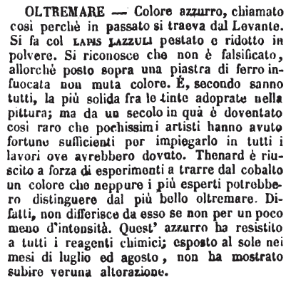 | Oltremare - Colore azzurro, chiamato così perchè in passato si traeva dal Levante. Si fa col lapis lazzuli pestato e ridotto in polvere. Si riconosce che non è falsificato, allorchè posto sopra una piastra di ferro infuocata non muta colore. E', secondo sanno tutti, la più solida fra le tinte adoprate nella pittura; ma da un secolo in quà è doventato così raro che pochissimi artisti hanno avuto fortune sufficienti per impiegarlo in tutti i lavori ove avrebbero dovuto. Thenard è riuscito a forza di esperimenti a trarre dal cobalto un colore che neppure i più esperti potrebbero distinguere dal più bello oltremare. Difatti, non differisce da esso se non per un poco meno d'intensità. Quest'azzurro ha resistito a tutti i reagenti chimici; esposto al sole nei mesi di luglio ed agosto, non ha mostrato subire veruna alterazione. [immagine] |