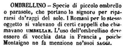 | Ombrello, Ombrellino, Ombrella - «Ombrello, quell'arnese coperto di seta, di tela incerata o d'altro, con che ci ripariamo dalla pioggia (parapluie): ombrellino, arnese simile ma più piccolo per difendere dal sole (parasol). Così l'uso toscano. Ombrella, che in molti paesi è sinonimo di ombrello, nella lingua scritta è il rezzo de' rami fronzuti e conserti di uno o più alberi; e s'usa più spesso in plurale; onde l'Ariosto: «facean riparo a' fervidi calori De' giorni estivi con lor spesse ombrelle». Polidori. [immagine] |