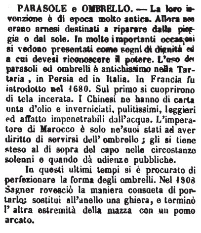 Parasole e Ombrello - La loro invenzione è di epoca molto antica. Allora non erano arnesi destinati a riparare dalla pioggia o dal sole. In molte importanti occasioni si vedono presentati come segni di dignità ed a cui devesi riconoscere il potere. L'uso dei parasoli ed ombrelli è antichissimo nella Tartaria, in Persia ed in Italia. In Francia fu introdotto nel 1680. Sul primo si cuoprirono di tela incerata. I Chinesi ne hanno di carta unta d'olio e inverniciati, pulitissimi, leggieri ed affatto impenetrabili dall'acqua. L'imperatore di Marocco è solo ne' suoi stati ad aver diritto di servirsi dell'ombrello; gli si tiene steso al di sopra del capo nelle circostanze solenni e quando dà udienze pubbliche.