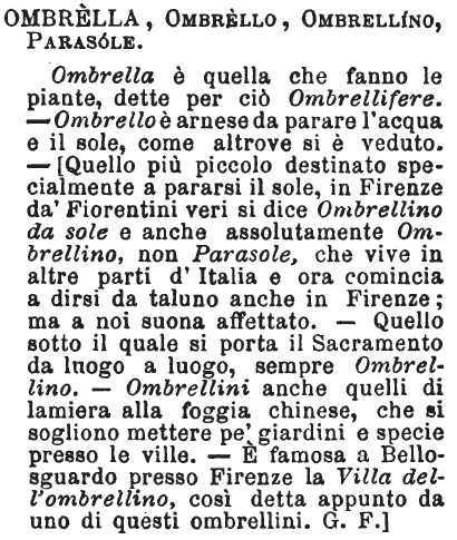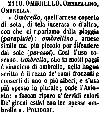 Ombrello, Ombrellino, Ombrella - «Ombrello, quell'arnese coperto di seta, di tela incerata o d'altro, con che ci ripariamo dalla pioggia (parapluie): ombrellino, arnese simile ma più piccolo per difendere dal sole (parasol). Così l'uso toscano. Ombrella, che in molti paesi è sinonimo di ombrello, nella lingua scritta è il rezzo de' rami fronzuti e conserti di uno o più alberi; e s'usa più spesso in plurale; onde l'Ariosto: «facean riparo a' fervidi calori De' giorni estivi con lor spesse ombrelle». Polidori. [immagine]