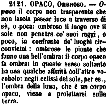 | Opaco, Ombroso - Opaco il corpo non trasparente che non lascia passar luce a traverso di sè, o poca: ombroso il luogo ove il sole non penetra co' suoi raggi, o poco, in confronto de' luoghi circonvicini: ombrose le piante che fanno una bell'ombra: il corpo opaco fa ombra: in questo senso soltanto ha una qualche affinità coll'altro vocabolo: negli eclissi del sole, per es., l'ombra della luna, che è un corpo opaco, viene a proiettarsi sulla terra. [immagine] |