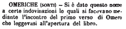| Usando "omeriche" (*) si possono ottenere i seguenti risultati: finiremo * = finche; periremo * = perché; dorremo * = doriche; vedremo * = vediche; chimo * = chieriche; colmo * = coleriche; decadremo * = decadiche; istmo * = isteriche; nummo * = numeriche. |