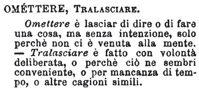 | Omettere, Tralasciare - Omettere è lasciar di dire o di fare una cosa, ma senza intenzione, solo perchè non ci è venuta alla mente.- Tralasciare è fatto con volontà deliberata, o perchè ciò ne sembri conveniente, o per mancanza di tempo, o altre cagioni simili. [immagine] |