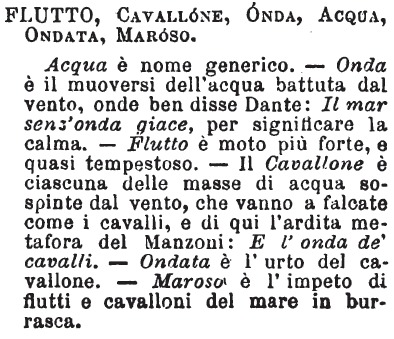 | Flutto, Cavallone, Onda, Acqua, Ondata, Maroso - Acqua è nome generico. - Onda è il muoversi dell'acqua battuta dal vento, onde ben disse Dante: Il mar senz'onda giace, per significare la calma. - Flutto è moto più forte, e quasi tempestoso. - Il Cavallone è ciascuna delle masse di acqua sospinte dal vento, che vanno a falcate come i cavalli, e di qui l'ardita metafora del Manzoni: E l'onda de' cavalli. - Ondata è l'urto del cavallone. - Maroso è l'impeto di flutti e cavalloni del mare in burrasca. [immagine] |