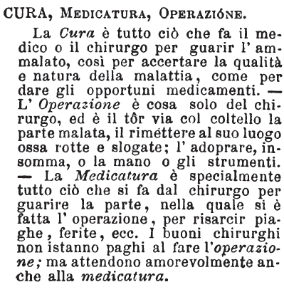 | Cura, Medicatura, Operazione - La Cura è tutto ciò che fa il medico o il chirurgo per guarir l'ammalato, così per accertare la qualità e natura della malattia, come per dare gli opportuni medicamenti. - L'Operazione è cosa solo del chirurgo, ed è il tôr via col coltello la parte malata, il rimettere al suo luogo ossa rotte e slogate; l'adoprare, insomma, o la mano o gli strumenti. - La Medicatura è specialmente tutto ciò che si fa dal chirurgo per guarire la parte, nella quale si è fatta l'operazione, per risarcir piaghe, ferite, ecc. I buoni chirurghi non istanno paghi al fare l'operazione; ma attendono amorevolmente anche alla medicatura. [immagine] |