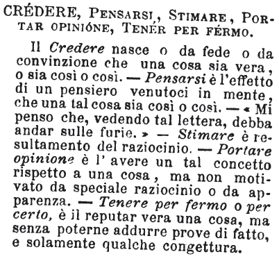 | Credere, Pensarsi, Stimare, Portar opinione, Tener per fermo - Il Credere nasce o da fede o da convinzione che una cosa sia vera, o sia così o così. - Pensarsi è l'effetto di un pensiero venutoci in mente, che una tal cosa sia così o così. - «Mi penso che, vedendo tal lettera, debba andar sulle furie.» - Stimare è resultamento del raziocinio. - Portare opinione è l'avere un tal concetto rispetto a una cosa, ma non motivato da speciale raziocinio o da apparenza. - Tenere per fermo o per certo, è il reputar vera una cosa, ma senza poterne addurre prove di fatto, e solamente qualche congettura. [immagine] |
