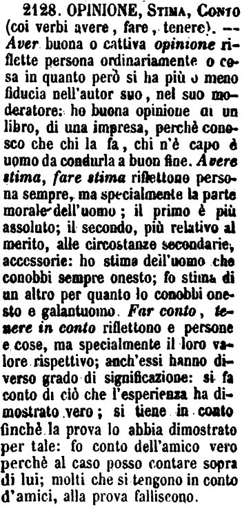 | Opinione, Stima, Conto (coi verbi avere, fare, tenere) - Aver buona o cattiva opinione riflette persona ordinariamente o cosa in quanto però si ha più o meno fiducia nell'autor suo, nel suo moderatore: ho buona opinione di un libro, di una impresa, perché conosco che chi la fa, chi n'è capo è uomo da condurla a buon fine. Avere stima, fare stima riflettono persona sempre, ma specialmente la parte morale dell'uomo; il primo è più assoluto; il secondo, più relativo al merito, alla circostanze secondarie, accessorie: ho stima dell'uomo che conobbi sempre onesto; fo stima di un altro per quanto lo conobbi onesto e galantuomo. Far conto, tenere in conto riflettono e persone e cose, ma specialmente il loro valore rispettivo; anch'essi hanno diverso grado di significazione: si fa conto di ciò che l'esperienza ha dimostrato vero; si tiene in conto finchè la prova lo abbia dimostrato per tale: fo conto dell'amico vero perché al caso posso contare sopra di lui; molti che si tengono in conto d'amici, alla prova falliscono. [immagine] |