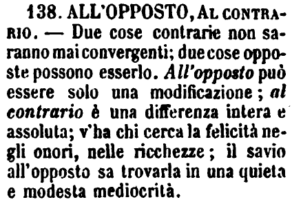 | All’opposto, Al contrario - Due cose contrarie non saranno mai convergenti: due cose opposte possono esserlo. All'opposto può essere solo una modificazione; al contrario è una differenza intera e assoluta; v'ha chi cerca la felicità negli onori, nelle ricchezze; il savio all'opposto sa trovarla in una quieta e modesta mediocrità. [immagine] |