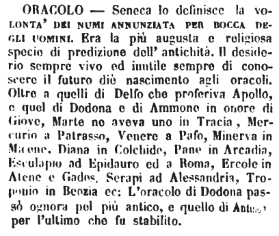 | Oracolo - Seneca lo definisce la volontà dei numi annunziata per bocca degli uomini. Era la più augusta e religiosa specie di predizione dell'antichità. Il desiderio sempre vivo ed inutile sempre di conoscere il futuro diè nascimento agli oracoli. Oltre a quelli di Delfo che proferiva Apollo, e quel di Dodona e di Ammone in onore di Giove, Marte ne aveva uno in Tracia, Mercurio a Patrasso, Venere a Pafo, Minerva in Micene, Diana in Colchide, Pane in Arcadia, Esculapio ad Epidauro ed a Roma, Ercole in Atene e Gades, Serapi ad Alessandria, Troponio in Beozia ec: L'oracolo di Dodona passò ognora pel più antico, e quello di Antinoo per l'ultimo che fu stabilito. [immagine] |