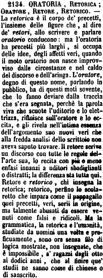 | Oratoria, Retorica; Oratore, Retore, Retorico - La retorica è il corpo de' precetti, l'insieme delle figure che, al dire de' retori, allo scrivere e parlare oratorio conducono: ma l'oratoria ha precetti più larghi, si occupa delle idee, degli affetti veri, quando il moto oratorio non nasce improvviso dalle circostanze e nel caldo del discorso e dell'aringa. L'oratore, degno di questo nome, parlando in pubblico, ha di questi moti sovente, che lo fanno deviare dalla traccia che s'era segnata, perchè la parola viva che scuote l'uditorio e lo elettrizza, rifluisce sull'oratore e lo eccita, e gli rivela nell'intima essenza dell'argomento suo nuovi veri che alla fredda analisi dello scrittoio non aveva saputo trovare. Il retore scrive un discorso con tutte le regole dell'arte sua, lo recita con più o meno enfasi innanzi a uditori sbadiglianti o distratti; la differenza sta tutta qui. Retore e retorico, chi insegna la retorica; retorico, perfino lo scolaretto che impara come il pappagallo quei precetti, veri, serii in origine, ma talmente abusati da essere venuti come falsi e ridicoli. Ma la grammatica, la retorica e l'umanità, studiate da uomini una volta e proficuamente, sono ora senza filo di logica mostrate, non insegnate, che è impossibile, a' ragazzi dagli otto ai dodici anni, che al finire que' studii ne sanno come di chinese o di sanscrito. [immagine] |