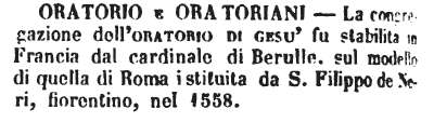 | Oratorio e Oratoriani - La congregazione dell'oratorio di Gesù fu stabilita in Francia dal cardinale di Berulle, sul modello di quella di Roma istituita da S. Filippo de Neri, fiorentino, nel 1558. [immagine] |