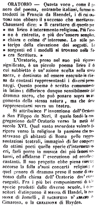 L'Oratorio, preso nel suo più rigoroso significato, è un piccolo poema lirico il di cui subbietto è un'azione scelta nella storia sacra, e destinato ad essere eseguito in chiesa da cantanti rappresentanti i diversi personaggi. Questo poema è scritto comunemente in latino; differisce dunque sensibilmente dal dramma sacro, che può posare sopra un argomento della stessa natura, ma che deve rappresentarsi sovra un teatro. Si attribuisce l'invenzione dell'Oratorio a San Filippo de Neri, il quale fondò la congregazione dell'Oratorio verso la metà del secolo XVI. Quel santo sacerdote volendo dirigere verso la religione la passione che mostravano gli abitanti di Roma pelle rappresentazioni teatrali, immaginò di far comporre da ottimi poeti quelle specie d'intermezzi sacri, farli porre in musica dai più famosi virtuosi, ed affidarne l'esecuzione ad eccellenti cantanti. Il suo progetto ebbe piena riuscita: accorse la folla a' suoi concerti religiosi; e quel genere di dramma prese il nome di oratorio dalla chiesa dell'Oratorio dov'erano eseguiti. Fra i più bei componimenti di tale specie prodotti dalle diverse scuole, i conoscitori distinguono il Messia di Handel, la Passione di Jomelli, il Sacrifizio d'Abramo di Cimarosa, e la Creazione di Hayden. [immagine] |