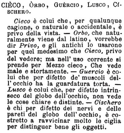| Cieco, Orbo, Guercio, Lusco, Cischero - Cieco è colui che, per qualunque cagione, o naturale o accidentale, è privo della vista. - Orbo, che naturalmente viene dal latino, vorrebbe dir Privo, e gli antichi lo usarono per quel medesimo che Cieco, privo del vedere; ma nell’uso corrente si prende per Mezzo cieco, Che vede male e stortamente. - Guercio è colui che per difetto de’ muscoli dell’occhio ha la guardatura torta. - Lusco è colui che, per difetto intrinseco del globo dell’occhio, non vede le cose chiare e distinte. - Cischero è chi per difetto dei nervi e delle pareti del globo dell’occhio, è costretto a ravvicinar molto le ciglia per distinguer bene gli oggetti. [immagine] |