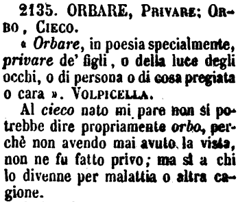 | Orbare, Privare; Orbo, Cieco - « Orbare, in poesia specialmente, privare de' figli, o della luce degli occhi, o di persona o di cosa pregiata o cara ». Volpicella.