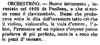 | Orchestrino - Nuovo istrumento, inventato nel 1805 da Poulleau, e che si suona come il clavicembalo. Dicesi che produceva sotto le dita dell'inventore tutto ciò che il violino, violoncello, la viola d'amore, l'oboe, l'armonica ed un ripieno d'organo ponno produrre di più perfetto, tanto in a solo che in pezzi d'insieme. [immagine] |